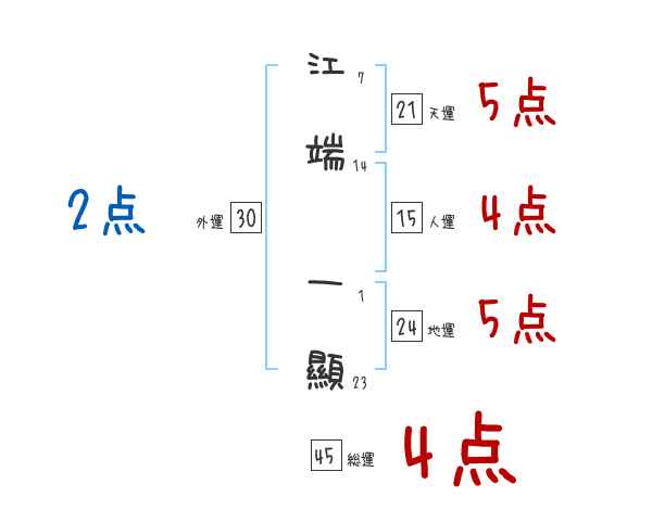 天運![]() | 江端一顯さんの天運は21画の5つ星!統率力がある。独立し成功する。名誉を手に入れる。 家系が持つ宿命的な運勢を表します。祖先から受け継いだ苗字ですので自分の力が及びません。家柄を象徴します。 |