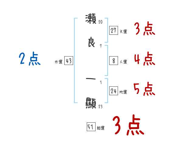 外運![]() | 瀬良一顯さんの外運は43画の2つ星!頑固な性格で独立心が強いかも。やや非現実的で浪費に注意しましょう。 生活面を象徴する運勢です。外部から受ける影響力を表し、結婚運、家庭運や職場、環境への順応性を表します。 |
