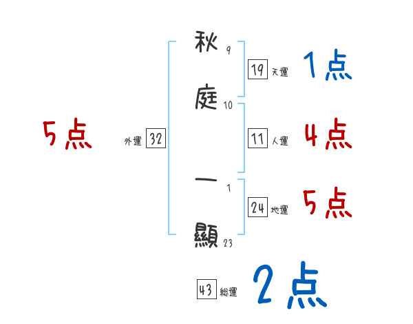 外運![]() | 秋庭一顯さんの外運は32画の5つ星!柔軟性があり成功する。チャンスが多く金運が良い。 生活面を象徴する運勢です。外部から受ける影響力を表し、結婚運、家庭運や職場、環境への順応性を表します。 |