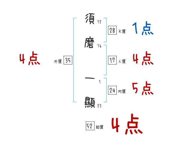 外運![]() | 須磨一顯さんの外運は35画の4つ星!温厚な性格で感受性が高い。穏和な性格で人望が厚い。 生活面を象徴する運勢です。外部から受ける影響力を表し、結婚運、家庭運や職場、環境への順応性を表します。 |