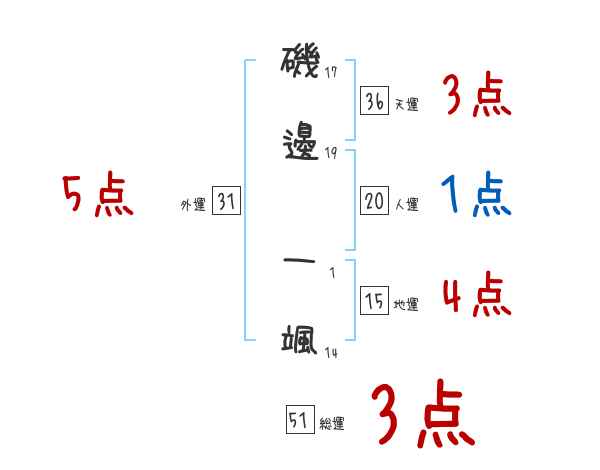外運![]() | 磯邊一颯さんの外運は31画の5つ星!社交性があり判断力に優れる。順風満帆な人生で円満な生活。 生活面を象徴する運勢です。外部から受ける影響力を表し、結婚運、家庭運や職場、環境への順応性を表します。 |