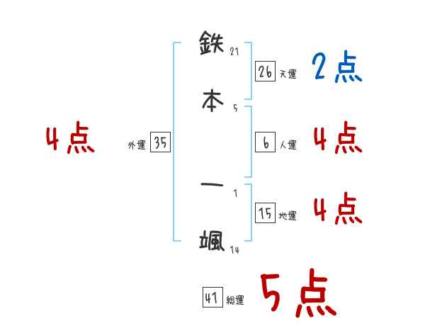 総運![]() | 鉄本一颯さんの総運は41画の5つ星!大志を抱き、目標に向かって実力を発揮し達成する。温和な性格。 あなたの人生を表す1番重要な運勢です。生涯を通じて影響する総合運となり、主に50歳以降の晩年期に影響を及ぼします。 |