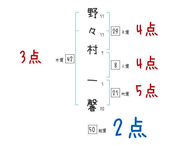 総運![]() | 野々村一馨さんの総運は50画の2つ星!浮き沈みが激しく不安定。しりすぼみに衰退しやすいので注意しましょう。 あなたの人生を表す1番重要な運勢です。生涯を通じて影響する総合運となり、主に50歳以降の晩年期に影響を及ぼします。 |