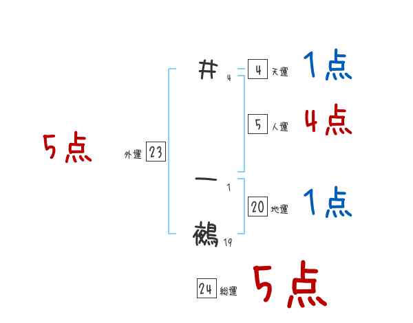 総運![]() | 井一鵺さんの総運は24画の5つ星!家庭運が良く順調な人生。金運にも恵まれる。 あなたの人生を表す1番重要な運勢です。生涯を通じて影響する総合運となり、主に50歳以降の晩年期に影響を及ぼします。 |
