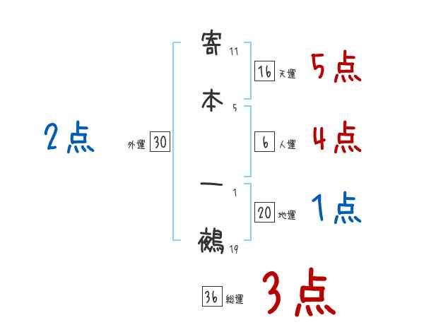 天運![]() | 寄本一鵺さんの天運は16画の5つ星!人望が厚く大きく発展する。逆転成功が見える。 家系が持つ宿命的な運勢を表します。祖先から受け継いだ苗字ですので自分の力が及びません。家柄を象徴します。 |
