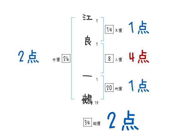 総運![]() | 江良一鵺さんの総運は34画の2つ星!独創性に優れるが、自尊心が強く災難に注意しましょう。 あなたの人生を表す1番重要な運勢です。生涯を通じて影響する総合運となり、主に50歳以降の晩年期に影響を及ぼします。 |