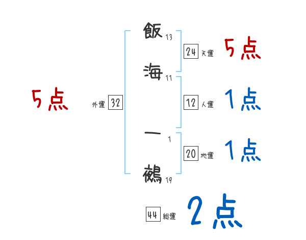 外運![]() | 飯海一鵺さんの外運は32画の5つ星!柔軟性があり成功する。チャンスが多く金運が良い。 生活面を象徴する運勢です。外部から受ける影響力を表し、結婚運、家庭運や職場、環境への順応性を表します。 |