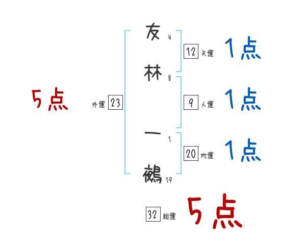 総運![]() | 友林一鵺さんの総運は32画の5つ星!柔軟性があり成功する。チャンスが多く金運が良い。 あなたの人生を表す1番重要な運勢です。生涯を通じて影響する総合運となり、主に50歳以降の晩年期に影響を及ぼします。 |