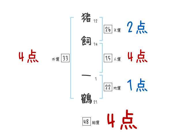 外運![]() | 猪飼一鶴さんの外運は33画の4つ星!権力志向でプライドが高い。勇気があり運を切り開き成功する。 生活面を象徴する運勢です。外部から受ける影響力を表し、結婚運、家庭運や職場、環境への順応性を表します。 |