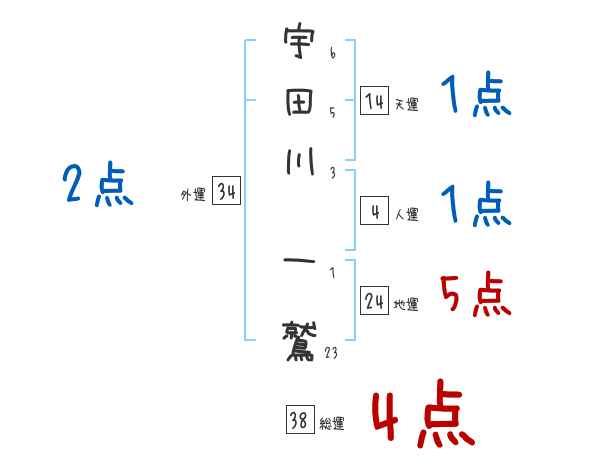 天運![]() | 宇田川一鷲さんの天運は14画の1つ星!人に対して優しいがストレスを溜め込みがち。人間関係のトラブルを避けるよう気をつけましょう。 家系が持つ宿命的な運勢を表します。祖先から受け継いだ苗字ですので自分の力が及びません。家柄を象徴します。 |