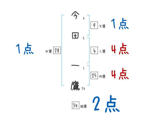 外運![]() | 今田一鷹さんの外運は28画の1つ星!家庭環境に注意。スポーツで活躍できる能力があるかも。 生活面を象徴する運勢です。外部から受ける影響力を表し、結婚運、家庭運や職場、環境への順応性を表します。 |
