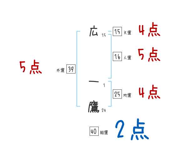 外運![]() | 広一鷹さんの外運は39画の5つ星!社交性に優れ人望が厚い。人の上に立ち成功する。 生活面を象徴する運勢です。外部から受ける影響力を表し、結婚運、家庭運や職場、環境への順応性を表します。 |