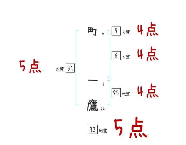 総運![]() | 町一鷹さんの総運は32画の5つ星!柔軟性があり成功する。チャンスが多く金運が良い。 あなたの人生を表す1番重要な運勢です。生涯を通じて影響する総合運となり、主に50歳以降の晩年期に影響を及ぼします。 |
