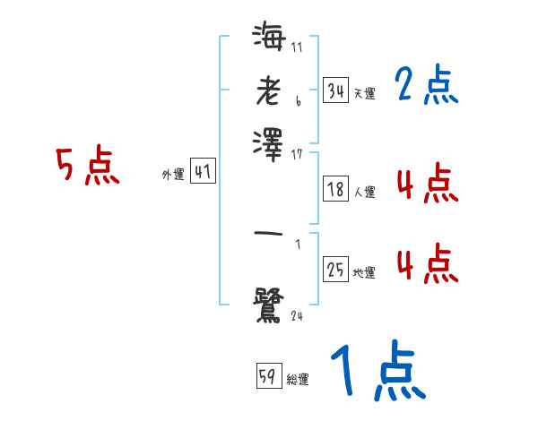 人運![]() | 海老澤一鷺さんの人運は18画の4つ星!情熱的で剛気。忍耐力があり信頼される。 性格や才能などを表す2番目に重要な運勢です。人間関係や協調性、社会的な成功に影響します。主に20歳から50歳ぐらいまでの中年期の運勢を表します。 |