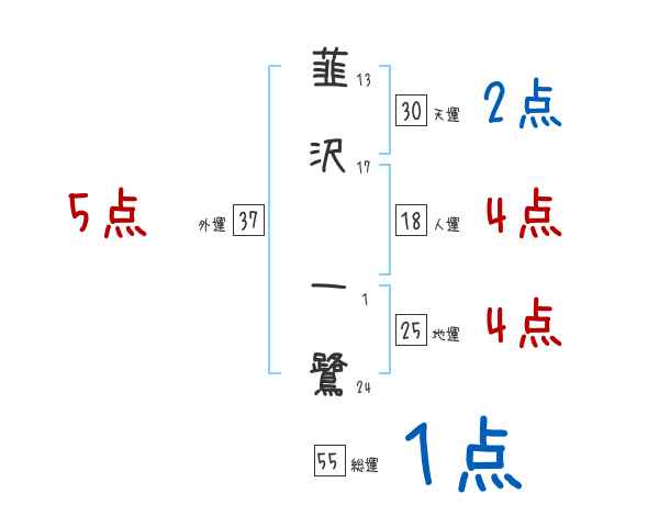 天運![]() | 韮沢一鷺さんの天運は30画の2つ星!浮き沈みの激しさに注意しましょう。 家系が持つ宿命的な運勢を表します。祖先から受け継いだ苗字ですので自分の力が及びません。家柄を象徴します。 |