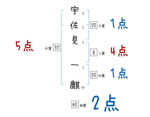 外運![]() | 宇佐見一麒さんの外運は32画の5つ星!柔軟性があり成功する。チャンスが多く金運が良い。 生活面を象徴する運勢です。外部から受ける影響力を表し、結婚運、家庭運や職場、環境への順応性を表します。 |