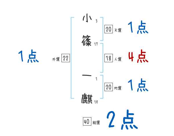 外運![]() | 小篠一麒さんの外運は22画の1つ星!努力することが苦手ないっぽう手先が器用。芸術性にも優れる。 生活面を象徴する運勢です。外部から受ける影響力を表し、結婚運、家庭運や職場、環境への順応性を表します。 |