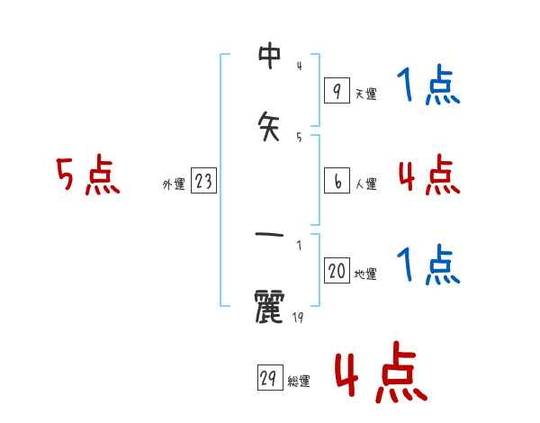天運![]() | 中矢一麗さんの天運は9画の1つ星!消極的で才能を発揮することが苦手なことも。周りの意見に耳を傾けましょう。 家系が持つ宿命的な運勢を表します。祖先から受け継いだ苗字ですので自分の力が及びません。家柄を象徴します。 |
