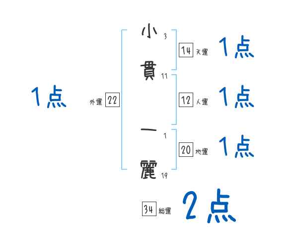 天運![]() | 小貫一麗さんの天運は14画の1つ星!人に対して優しいがストレスを溜め込みがち。人間関係のトラブルを避けるよう気をつけましょう。 家系が持つ宿命的な運勢を表します。祖先から受け継いだ苗字ですので自分の力が及びません。家柄を象徴します。 |