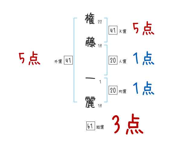 天運![]() | 権藤一麗さんの天運は41画の5つ星!大志を抱き、目標に向かって実力を発揮し達成する。温和な性格。 家系が持つ宿命的な運勢を表します。祖先から受け継いだ苗字ですので自分の力が及びません。家柄を象徴します。 |