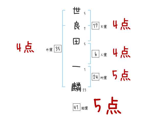 天運![]() | 世良田一麟さんの天運は17画の4つ星!積極的な行動力。地位を気づき財産を手に入れる。純粋な心と直感力。 家系が持つ宿命的な運勢を表します。祖先から受け継いだ苗字ですので自分の力が及びません。家柄を象徴します。 |
