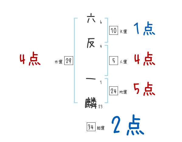 総運![]() | 六反一麟さんの総運は34画の2つ星!独創性に優れるが、自尊心が強く災難に注意しましょう。 あなたの人生を表す1番重要な運勢です。生涯を通じて影響する総合運となり、主に50歳以降の晩年期に影響を及ぼします。 |
