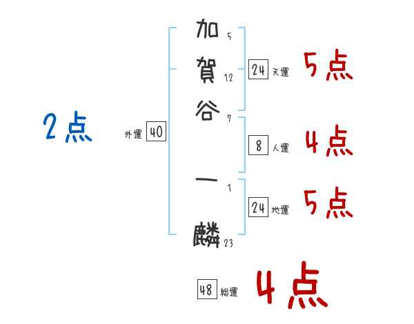 天運![]() | 加賀谷一麟さんの天運は24画の5つ星!家庭運が良く順調な人生。金運にも恵まれる。 家系が持つ宿命的な運勢を表します。祖先から受け継いだ苗字ですので自分の力が及びません。家柄を象徴します。 |