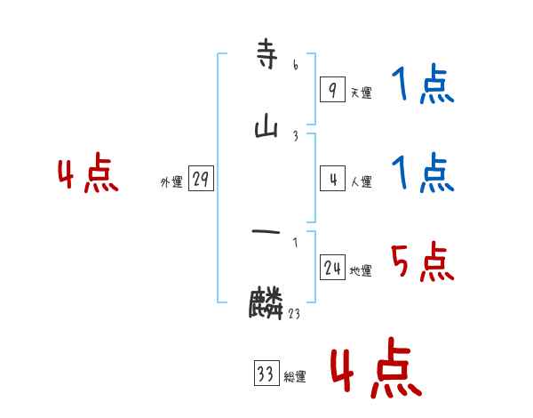 天運![]() | 寺山一麟さんの天運は9画の1つ星!消極的で才能を発揮することが苦手なことも。周りの意見に耳を傾けましょう。 家系が持つ宿命的な運勢を表します。祖先から受け継いだ苗字ですので自分の力が及びません。家柄を象徴します。 |
