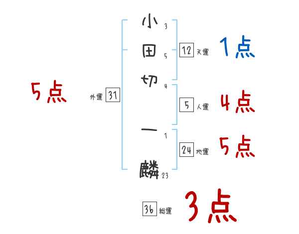 総運![]() | 小田切一麟さんの総運は36画の3つ星!先見性が豊かです。多少神経質で苦労することも。 あなたの人生を表す1番重要な運勢です。生涯を通じて影響する総合運となり、主に50歳以降の晩年期に影響を及ぼします。 |