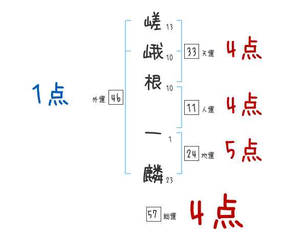 総運![]() | 嵯峨根一麟さんの総運は57画の4つ星!向上心があり人望がある。地位を得る。 あなたの人生を表す1番重要な運勢です。生涯を通じて影響する総合運となり、主に50歳以降の晩年期に影響を及ぼします。 |