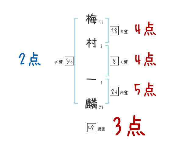 天運![]() | 梅村一麟さんの天運は18画の4つ星!情熱的で剛気。忍耐力があり信頼される。 家系が持つ宿命的な運勢を表します。祖先から受け継いだ苗字ですので自分の力が及びません。家柄を象徴します。 |