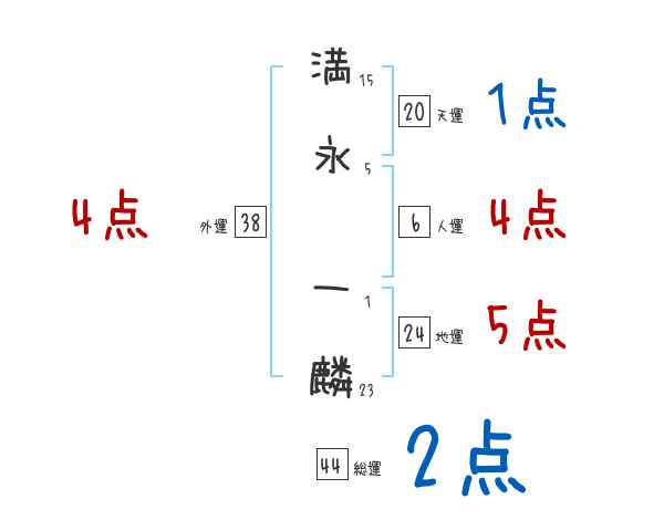 総運![]() | 満永一麟さんの総運は44画の2つ星!誠実で慎重な性格。物事を考えすぎないように注意しましょう。 あなたの人生を表す1番重要な運勢です。生涯を通じて影響する総合運となり、主に50歳以降の晩年期に影響を及ぼします。 |