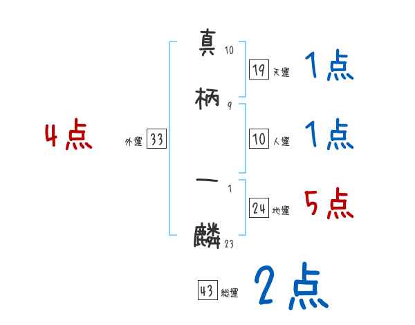 総運![]() | 真柄一麟さんの総運は43画の2つ星!頑固な性格で独立心が強いかも。やや非現実的で浪費に注意しましょう。 あなたの人生を表す1番重要な運勢です。生涯を通じて影響する総合運となり、主に50歳以降の晩年期に影響を及ぼします。 |
