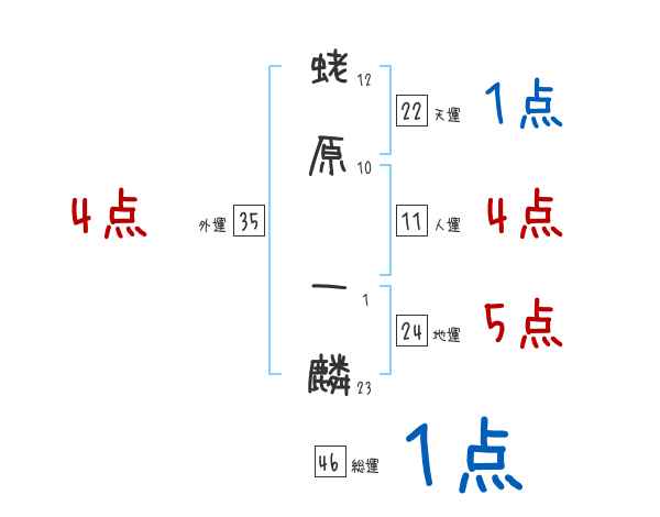 総運![]() | 蛯原一麟さんの総運は46画の1つ星!迷走することが多く苦労するかも。目先のことにとらわれないように。 あなたの人生を表す1番重要な運勢です。生涯を通じて影響する総合運となり、主に50歳以降の晩年期に影響を及ぼします。 |