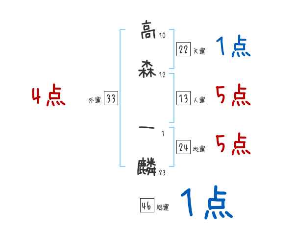 総運![]() | 高森一麟さんの総運は46画の1つ星!迷走することが多く苦労するかも。目先のことにとらわれないように。 あなたの人生を表す1番重要な運勢です。生涯を通じて影響する総合運となり、主に50歳以降の晩年期に影響を及ぼします。 |