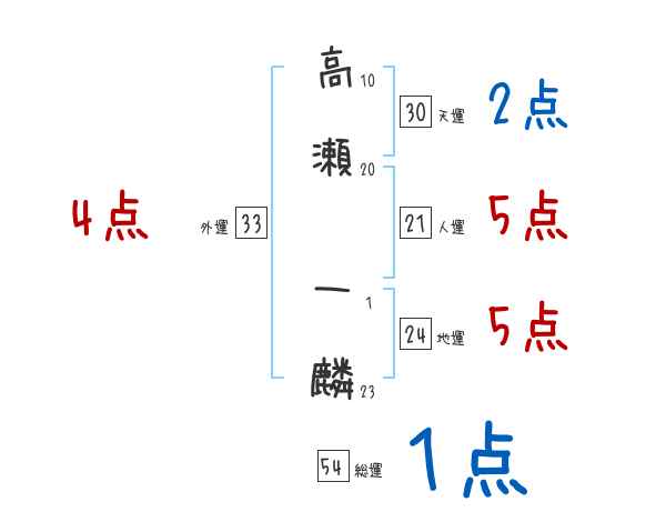 天運![]() | 高瀬一麟さんの天運は30画の2つ星!浮き沈みの激しさに注意しましょう。 家系が持つ宿命的な運勢を表します。祖先から受け継いだ苗字ですので自分の力が及びません。家柄を象徴します。 |