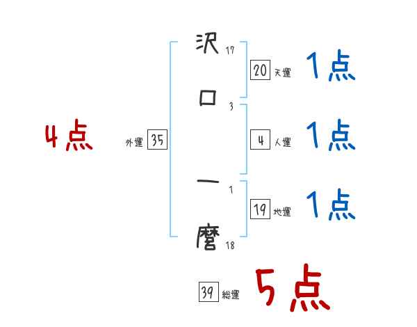 総運![]() | 沢口一麿さんの総運は39画の5つ星!社交性に優れ人望が厚い。人の上に立ち成功する。 あなたの人生を表す1番重要な運勢です。生涯を通じて影響する総合運となり、主に50歳以降の晩年期に影響を及ぼします。 |