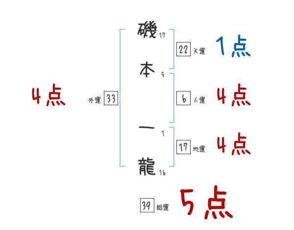 総運![]() | 磯本一龍さんの総運は39画の5つ星!社交性に優れ人望が厚い。人の上に立ち成功する。 あなたの人生を表す1番重要な運勢です。生涯を通じて影響する総合運となり、主に50歳以降の晩年期に影響を及ぼします。 |