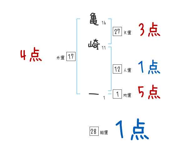 総運![]() | 亀崎一さんの総運は28画の1つ星!家庭環境に注意。スポーツで活躍できる能力があるかも。 あなたの人生を表す1番重要な運勢です。生涯を通じて影響する総合運となり、主に50歳以降の晩年期に影響を及ぼします。 |