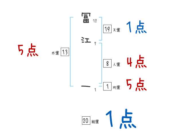 天運![]() | 冨江一さんの天運は19画の1つ星!優れた才能を持ちますが、協調性が足りないことも。周りの人と協力する事を意識しましょう。 家系が持つ宿命的な運勢を表します。祖先から受け継いだ苗字ですので自分の力が及びません。家柄を象徴します。 |