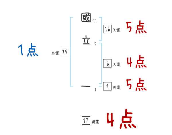 総運![]() | 國立一さんの総運は17画の4つ星!積極的な行動力。地位を気づき財産を手に入れる。純粋な心と直感力。 あなたの人生を表す1番重要な運勢です。生涯を通じて影響する総合運となり、主に50歳以降の晩年期に影響を及ぼします。 |