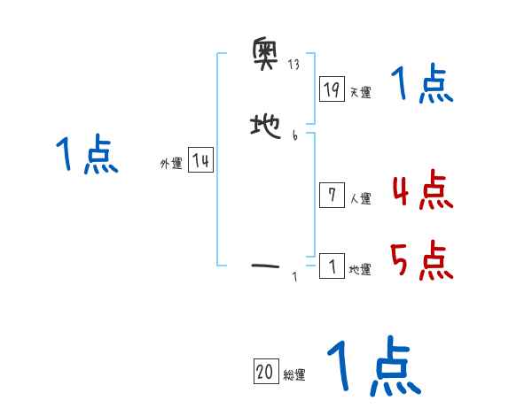 外運![]() | 奥地一さんの外運は14画の1つ星!人に対して優しいがストレスを溜め込みがち。人間関係のトラブルを避けるよう気をつけましょう。 生活面を象徴する運勢です。外部から受ける影響力を表し、結婚運、家庭運や職場、環境への順応性を表します。 |