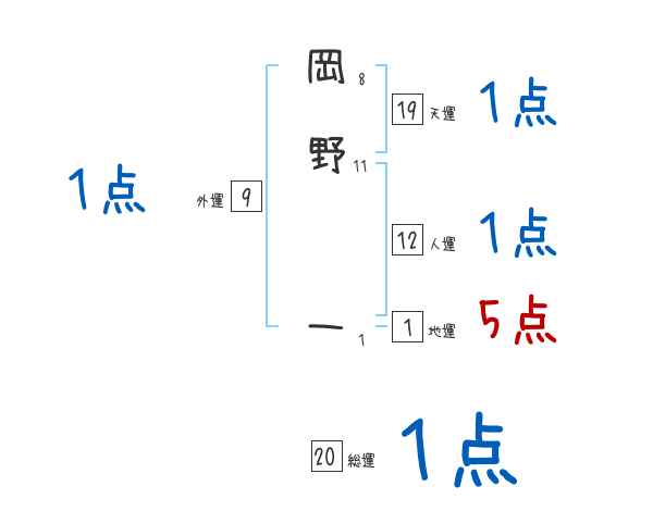 天運![]() | 岡野一さんの天運は19画の1つ星!優れた才能を持ちますが、協調性が足りないことも。周りの人と協力する事を意識しましょう。 家系が持つ宿命的な運勢を表します。祖先から受け継いだ苗字ですので自分の力が及びません。家柄を象徴します。 |