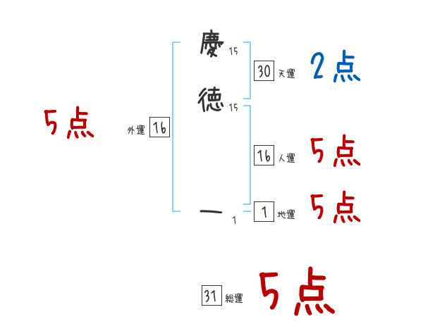 人運![]() | 慶徳一さんの人運は16画の5つ星!人望が厚く大きく発展する。逆転成功が見える。 性格や才能などを表す2番目に重要な運勢です。人間関係や協調性、社会的な成功に影響します。主に20歳から50歳ぐらいまでの中年期の運勢を表します。 |