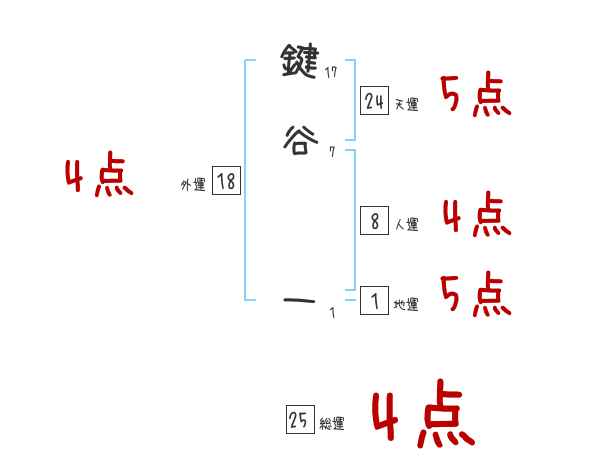 天運![]() | 鍵谷一さんの天運は24画の5つ星!家庭運が良く順調な人生。金運にも恵まれる。 家系が持つ宿命的な運勢を表します。祖先から受け継いだ苗字ですので自分の力が及びません。家柄を象徴します。 |