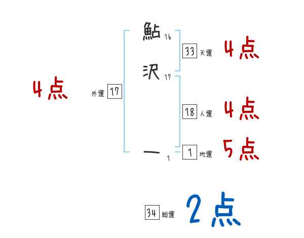 総運![]() | 鮎沢一さんの総運は34画の2つ星!独創性に優れるが、自尊心が強く災難に注意しましょう。 あなたの人生を表す1番重要な運勢です。生涯を通じて影響する総合運となり、主に50歳以降の晩年期に影響を及ぼします。 |