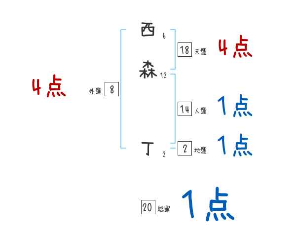 天運![]() | 西森丁さんの天運は18画の4つ星!情熱的で剛気。忍耐力があり信頼される。 家系が持つ宿命的な運勢を表します。祖先から受け継いだ苗字ですので自分の力が及びません。家柄を象徴します。 |