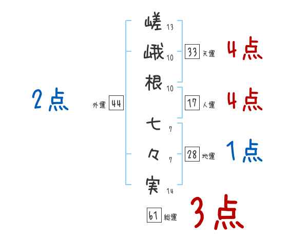 天運![]() | 嵯峨根七々実さんの天運は33画の4つ星!権力志向でプライドが高い。勇気があり運を切り開き成功する。 家系が持つ宿命的な運勢を表します。祖先から受け継いだ苗字ですので自分の力が及びません。家柄を象徴します。 |
