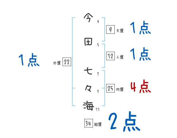 総運![]() | 今田七々海さんの総運は34画の2つ星!独創性に優れるが、自尊心が強く災難に注意しましょう。 あなたの人生を表す1番重要な運勢です。生涯を通じて影響する総合運となり、主に50歳以降の晩年期に影響を及ぼします。 |