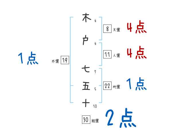 天運![]() | 木戸七五十さんの天運は8画の4つ星!勤勉家。根気強く努力し成功する。忍耐力がある。 家系が持つ宿命的な運勢を表します。祖先から受け継いだ苗字ですので自分の力が及びません。家柄を象徴します。 |